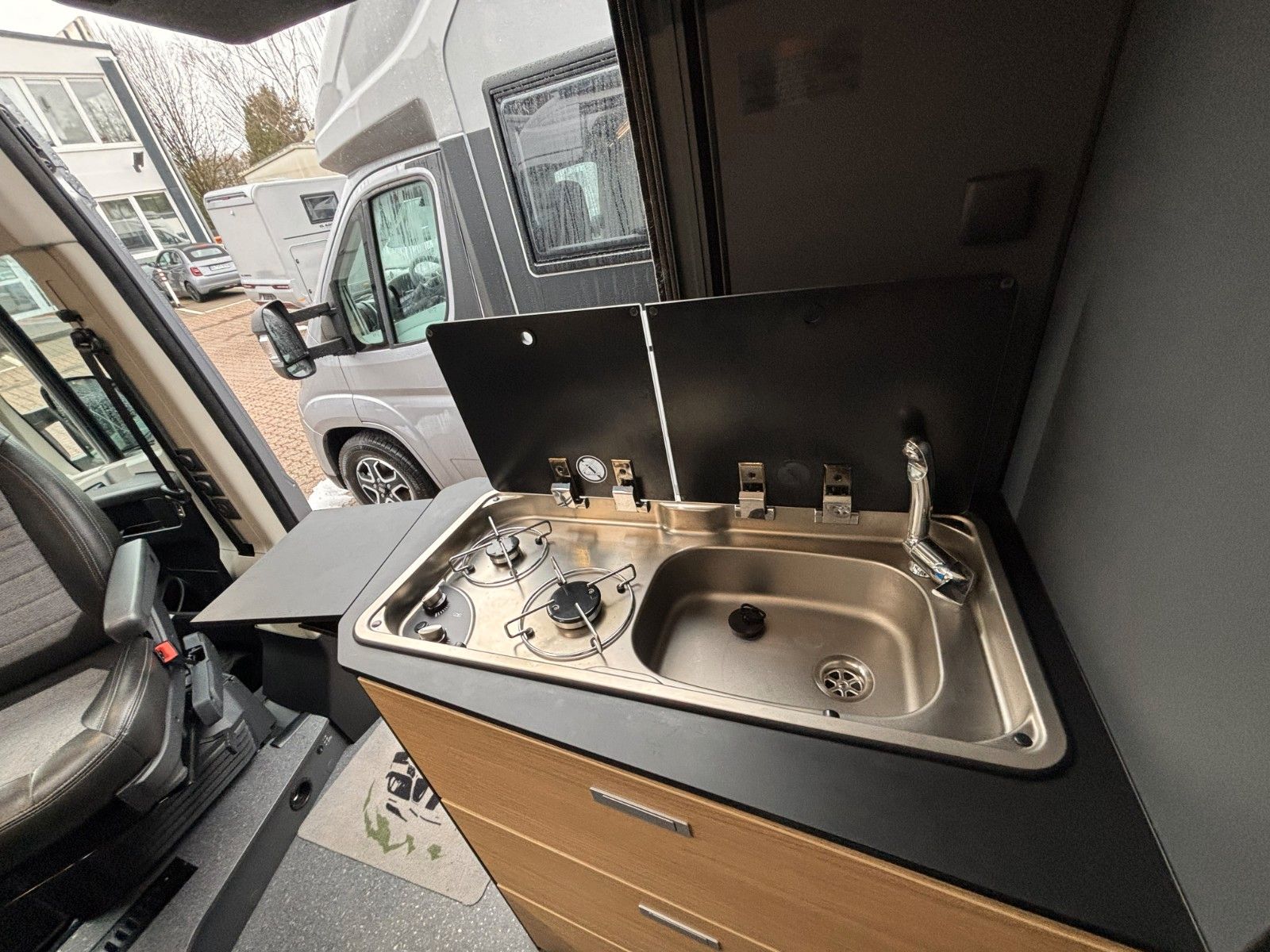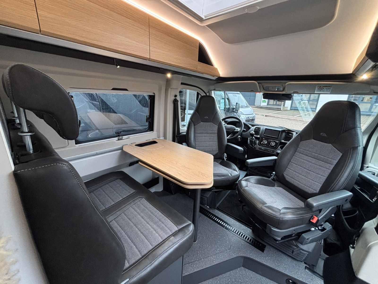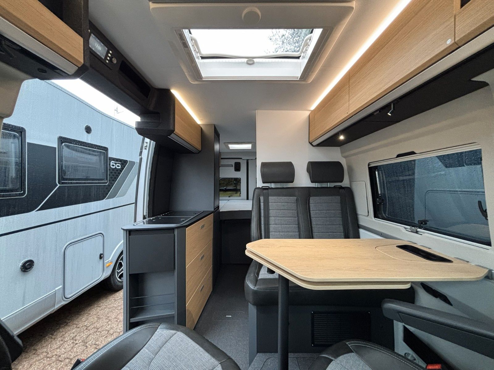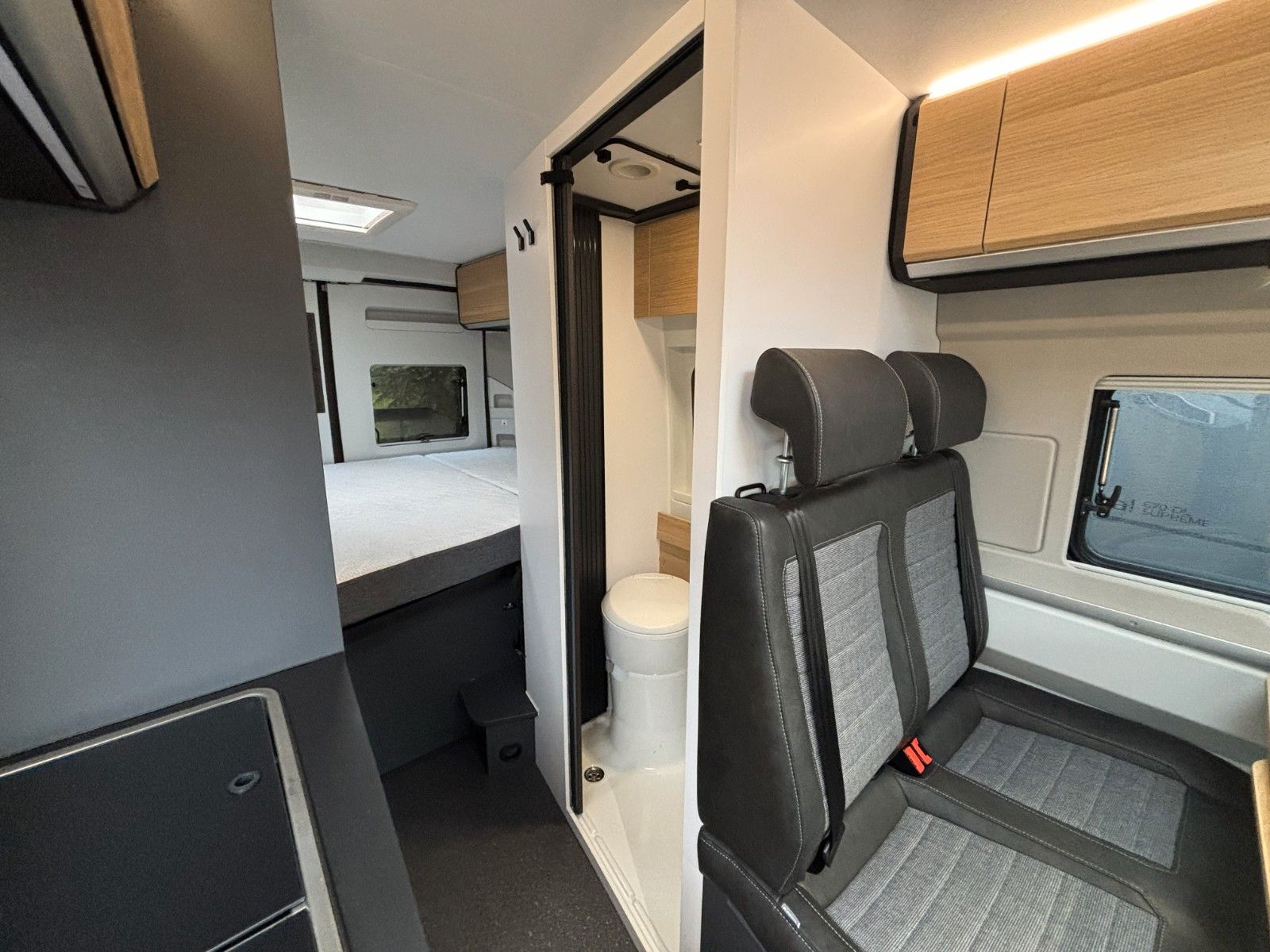 Optionen aus Kit de Luxe (Einparkhilfe hinten, Radio-Vorbereitung FH, Fahrerhaus und Wohnraumscheiben getönt, Wohnraum Seitenfenster mit Rahmen, Fenster inkl.Rahmen, Fenster inkl. Kombirollo auch in Hecktüre links, Falt-Verdunklung FH, Falt-Verdunklung Wohnraum-Seitenfenster, Fliegenschutz an Schiebetüre, Einstiegsstufe elektr., LED-Ambientebeleuchtung, Lade-Booster, Sicherheitsgasregler Mono-Control CS und Gasfilter, Abwassertank isoliert und beheizbar, Abwasserablassventil elektrisch, Abdeckung Kocher+Spüle, Tisch mit Ausdregerweiterung und Becherhalterunglsofix Kindersitzbefestigung Rückbank, Einparkhilfe hinten, DAB-Radio-Vorbereitung FH, Falt- Verdunkelung FH, Sonnenschutz-Markise, Federkern-Matratze auf Festbett(en), Ladebooster, Solar-Anlage, TFT-Halterung, Gasfilter) Solar-Anlage, Sonnenschutzmarkise
