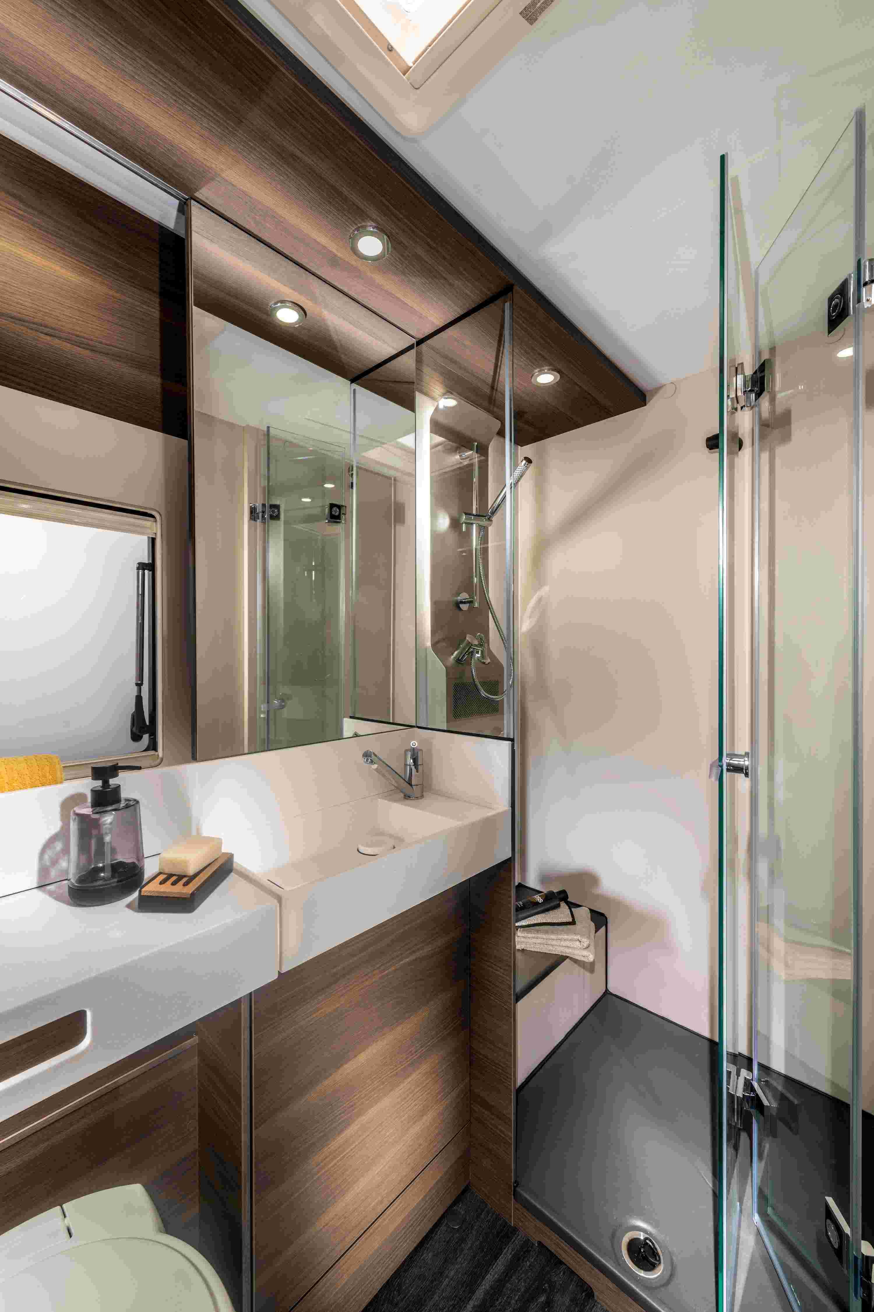 Im Bad überzeugt der Astella 754 DP mit festem Kerrock-Waschtisch, eleganten schwarzen Akzenten, separater Dusche, stimmungsvoller Ambientebeleuchtung und Seitenfenster zur optimalen Belüftung.