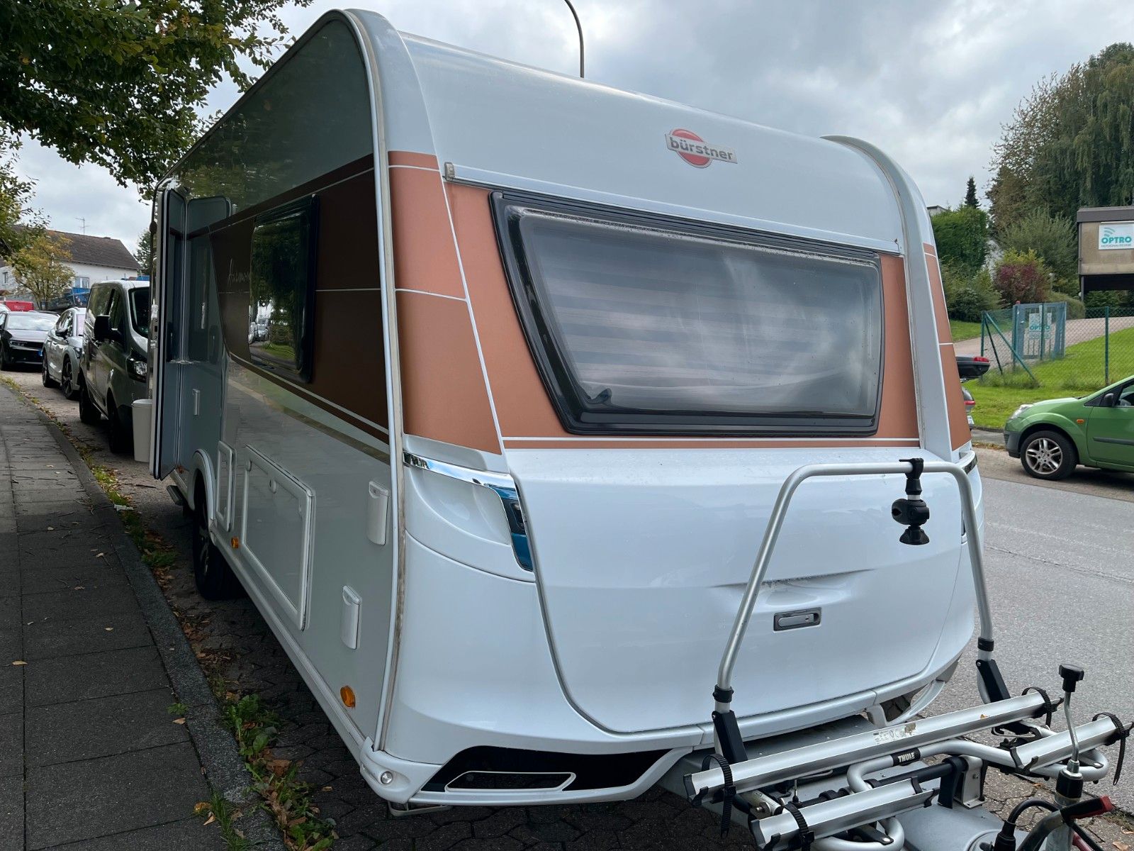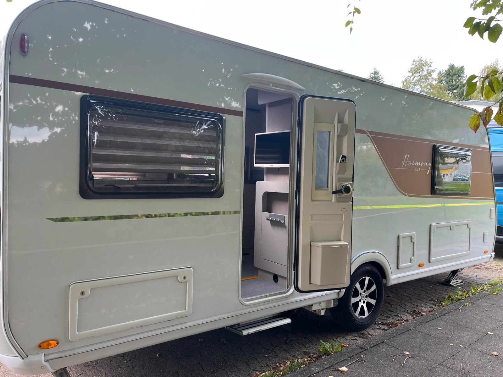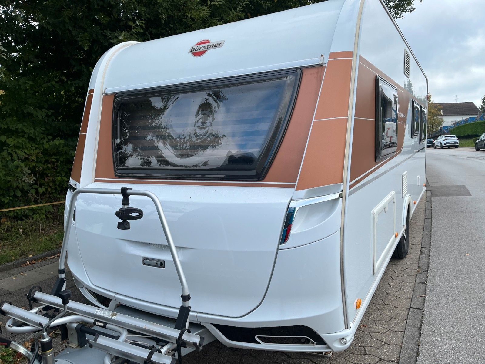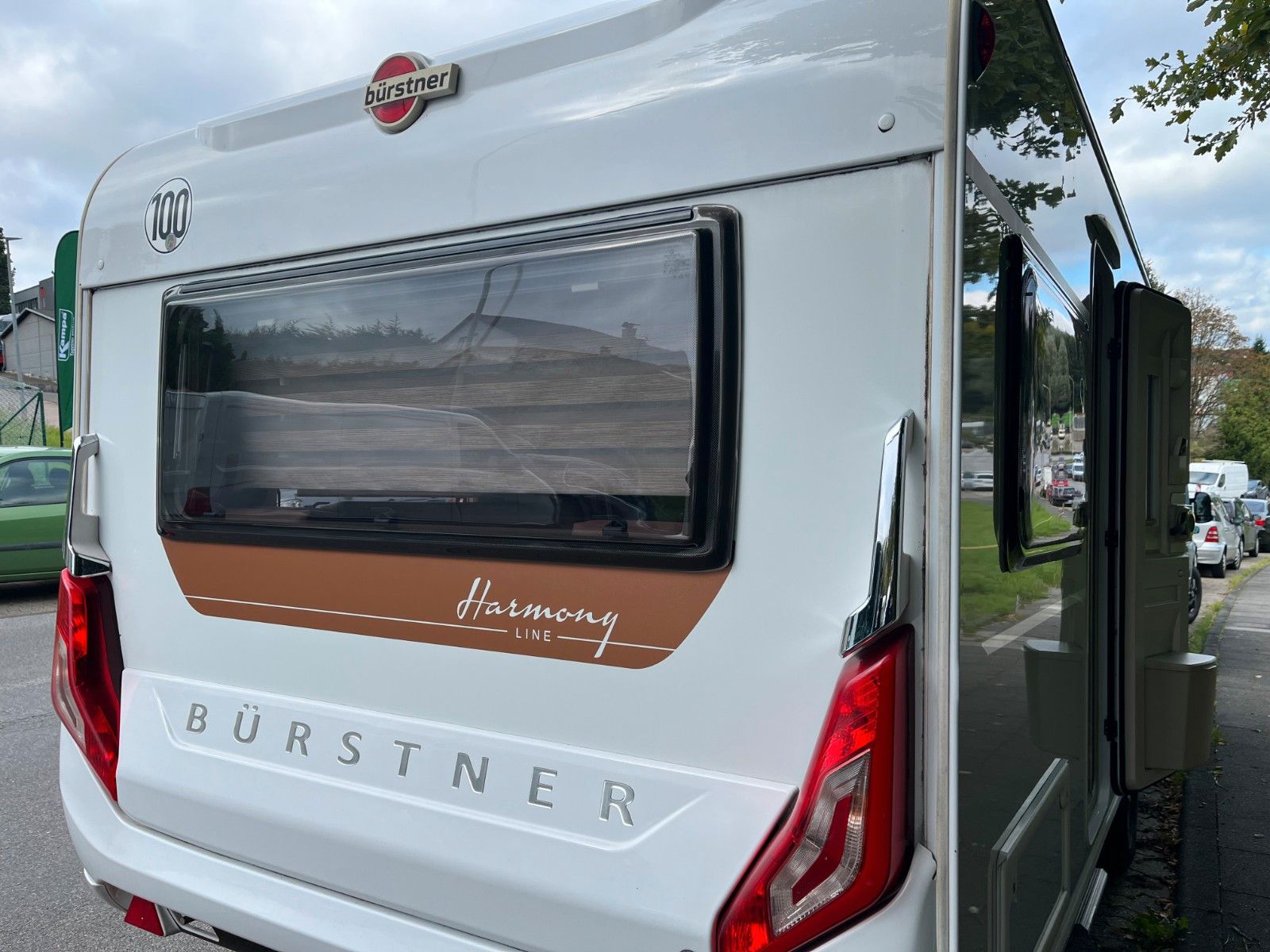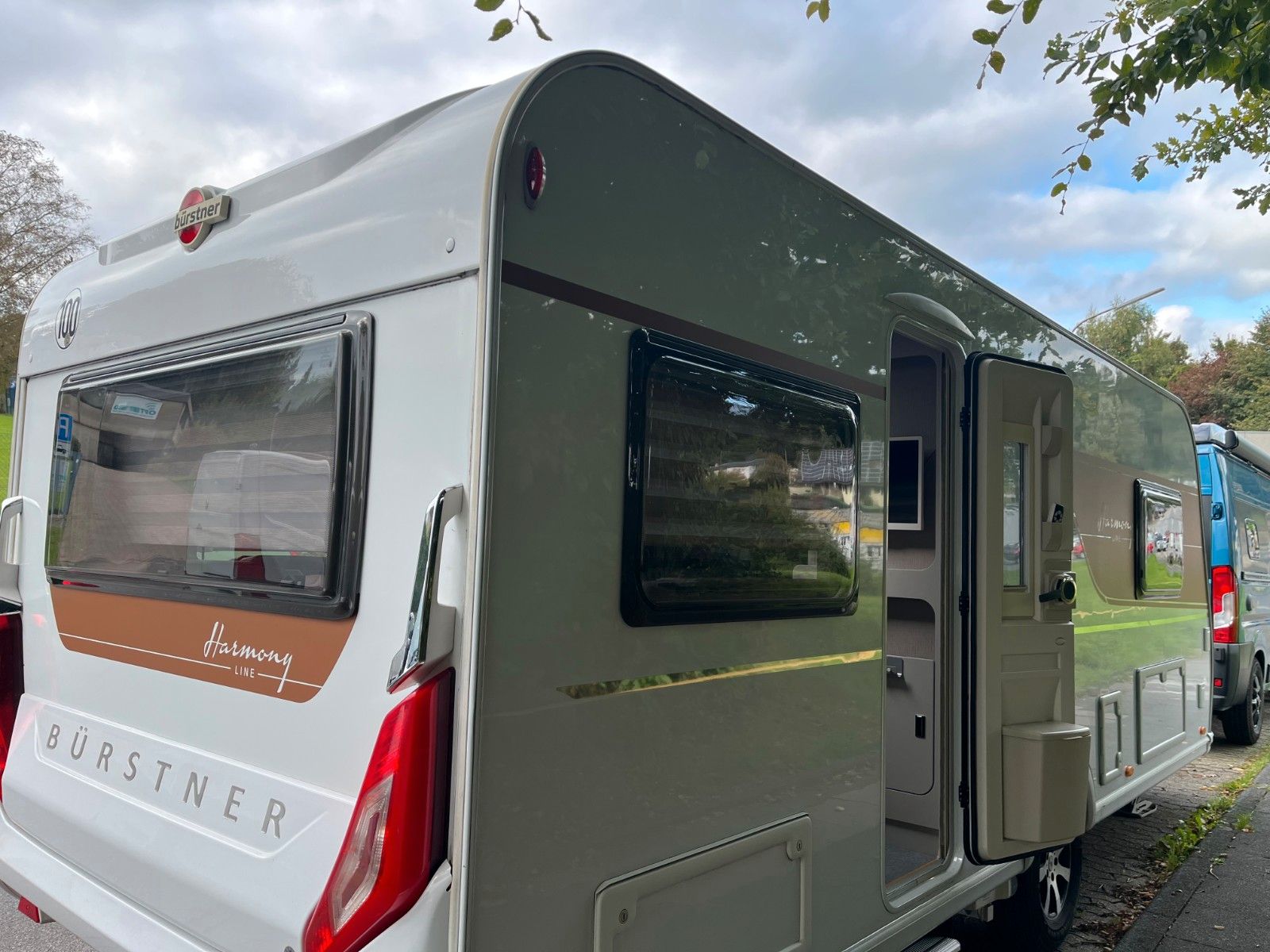 Durch einen Sturmschaden wurde eine Seite des Wohnwagens vom Bürstner Vertragshändler lackiert.