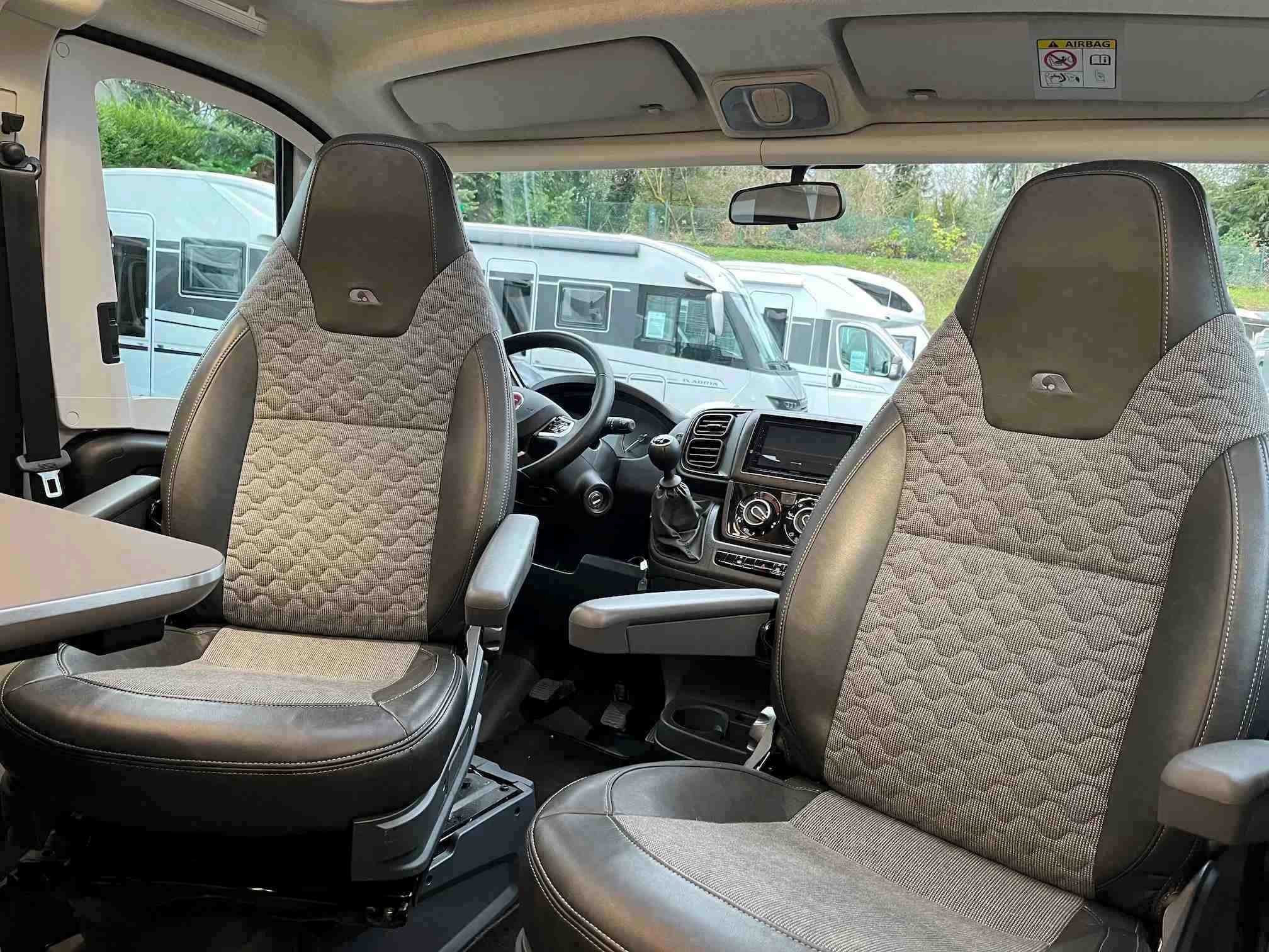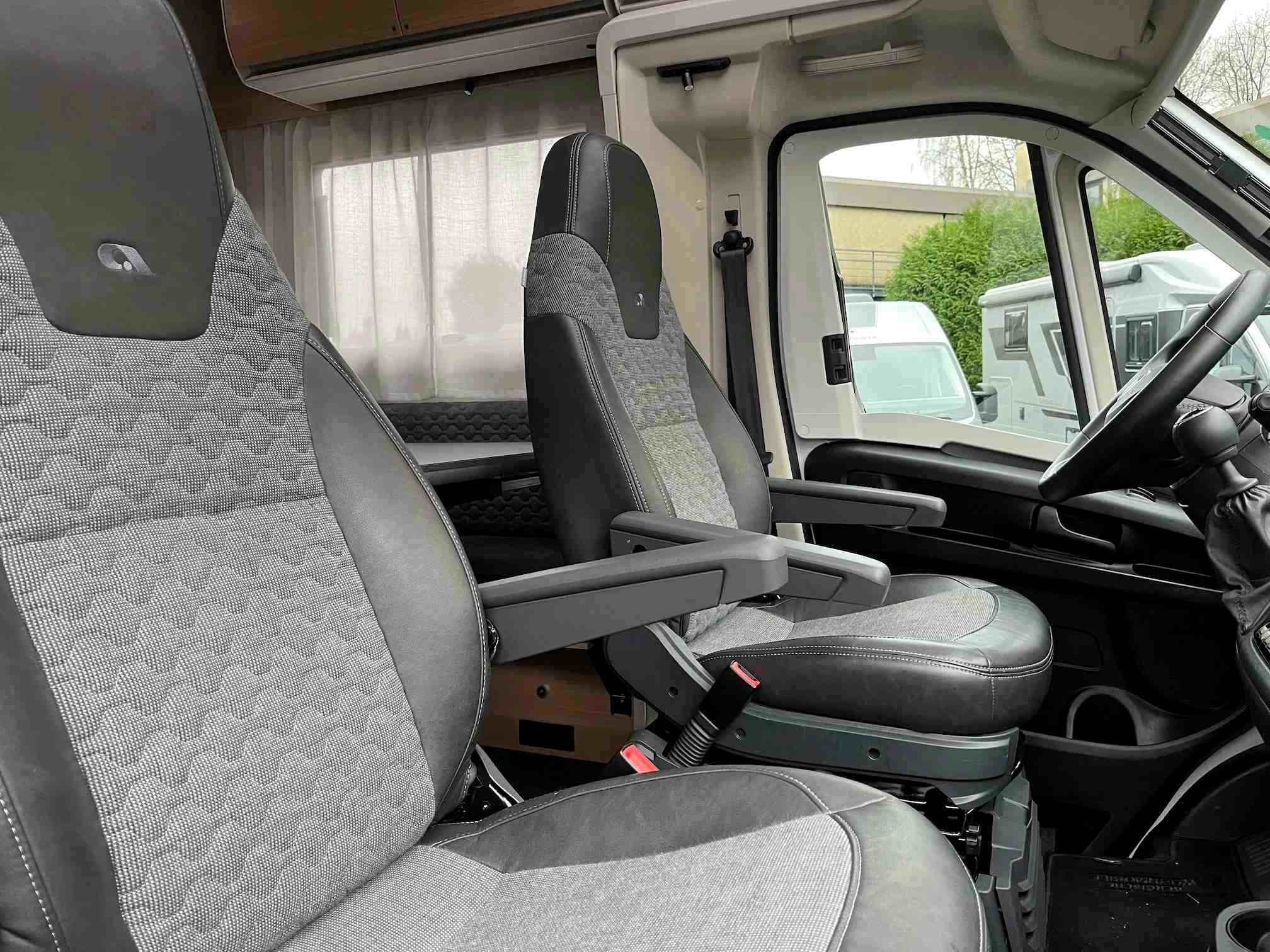 Dank des elektrisch absenkbaren Hubbetts und der Einzelbetten im Heck lässt sich der Raum flexibel nutzen – egal, ob du gemütlich entspannen oder unterwegs arbeitest.