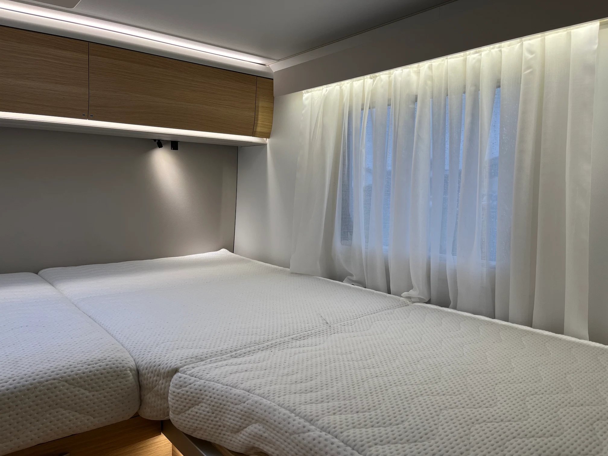 Dank des elektrisch absenkbaren Hubbetts und der Einzelbetten im Heck lässt sich der Raum flexibel nutzen – egal, ob du gemütlich entspannen oder unterwegs arbeitest.