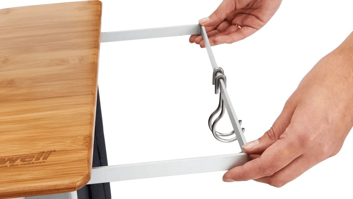 Die Arbeitsfläche ist mit einer Bambus Tischplatte versehen, die optisch hochwertig wirkt und zugleich praktisch ist. Auf einer Seite befinden sich mehrere Haken zur Befestigung von Utensilien, auf der anderen Seite eine Taschenstruktur zur geordneten Aufbewahrung kleiner Gegenstände.